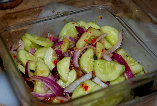 Peel cucumbers and onion. Slice cucumbers, onion and optional tomato and put into a bowl. Add in garlic and a pinch of salt and pepper. Now add the desired amount of Italian dressing. Usually comes to be about one cup or so. Mix altogether and chill. Serving Size: 4