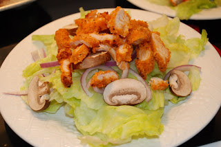 Buy a pack of spicy chicken filets, Tyson has a really good product. Pop them in the oven as the instructions say to. Chop up and wash the head of lettuce, wash and chop up the mushrooms, peel and chop the onion, add baby carrots if you like too. Place everything on the plate. Once the chicken is done, chop it up in strips, and place on top of the salad. Serve with your favorite dressing!